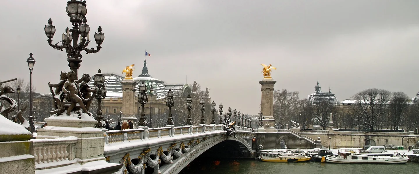 Pont Alexandre III prydet med sne og gyldne skulpturer, en vinterdag ved floden.